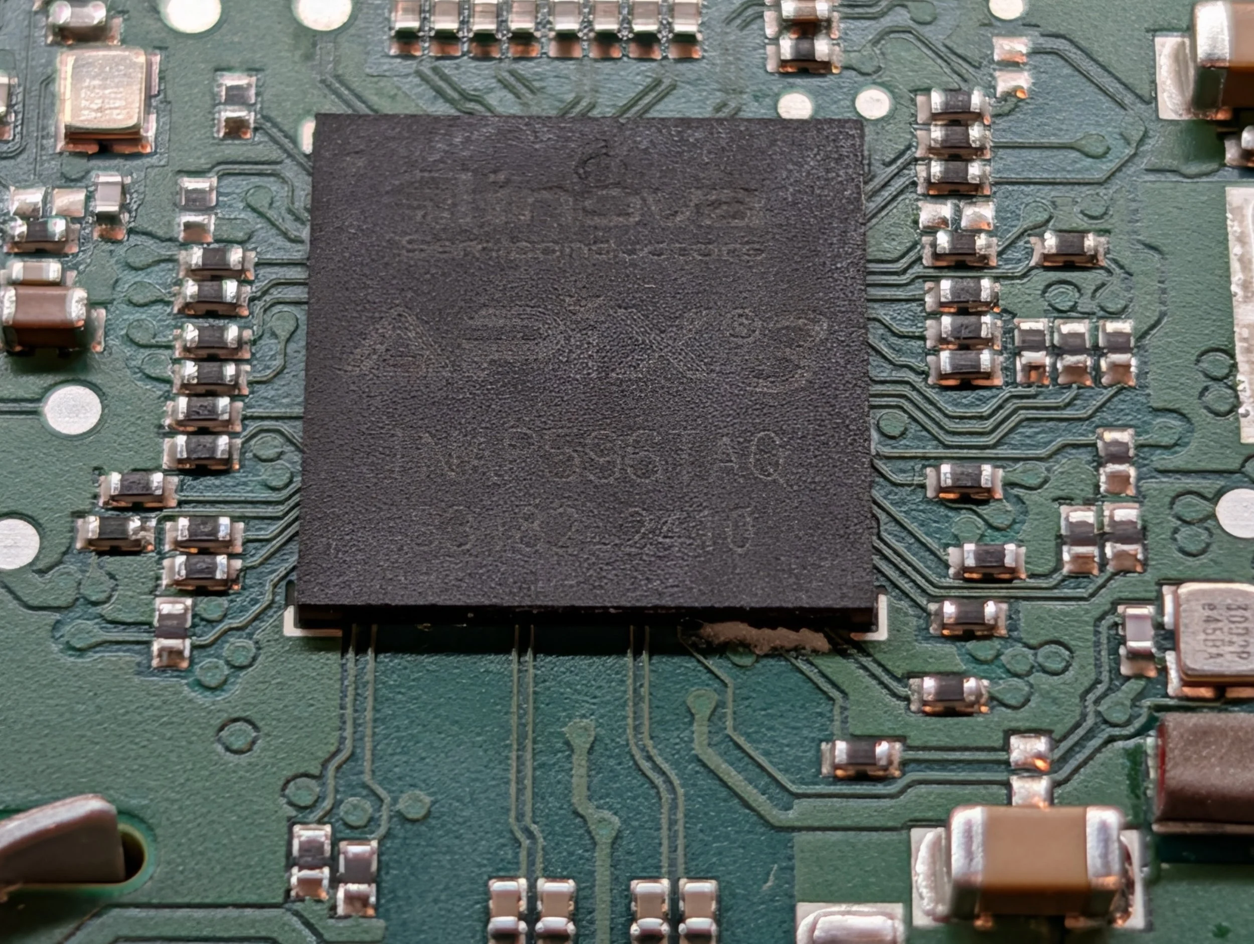 The stars of the show on this PCB are the two large Inova APiX 3 ICs, and their associated trio of connectors.